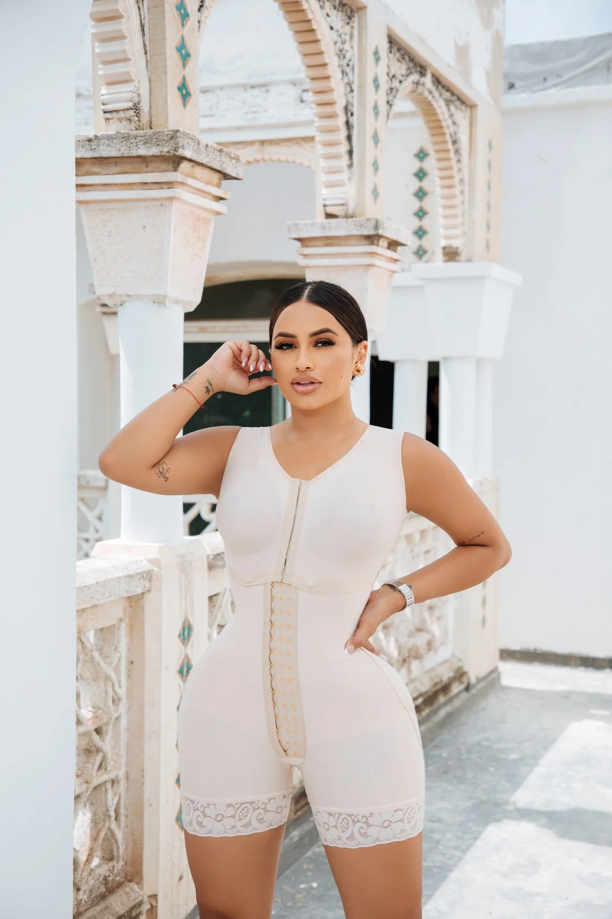 Su diseño es ideal tanto para uso diario como post operatorio, ofreciéndote una cobertura y protección desde la zona de tus hombros hasta la media pierna. También incluye un brasier prehormado para un mayor cubrimiento y redondeo natural del busto y que a su vez controla la postura. Esta maravillosa faja colombiana cuenta con triple refuerzo abdominal haciendo ver tu espectacular cintura mucho más pequeña, en la parte de atrás sentirás la comodidad y el realce natural de tus prominentes y redondeados glúteos.